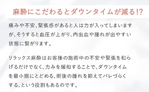 笑気麻酔は、施術中の不安や緊張を和らげるだけでなく力みも緩和するので、内出血やダウンタイムの腫れを最小限に抑え、バレづらくする役割も◎